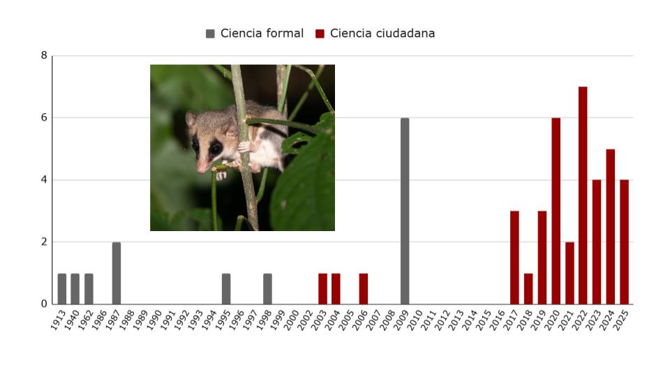 De los 51 registros conocidos de esta especie, tres de cada cuatro provienen de observaciones hechas en la plataforma de ciencia ciudadana, mientras que sólo una cuarta parte corresponde a estudios o registros científicos tradicionales (Figura 1).