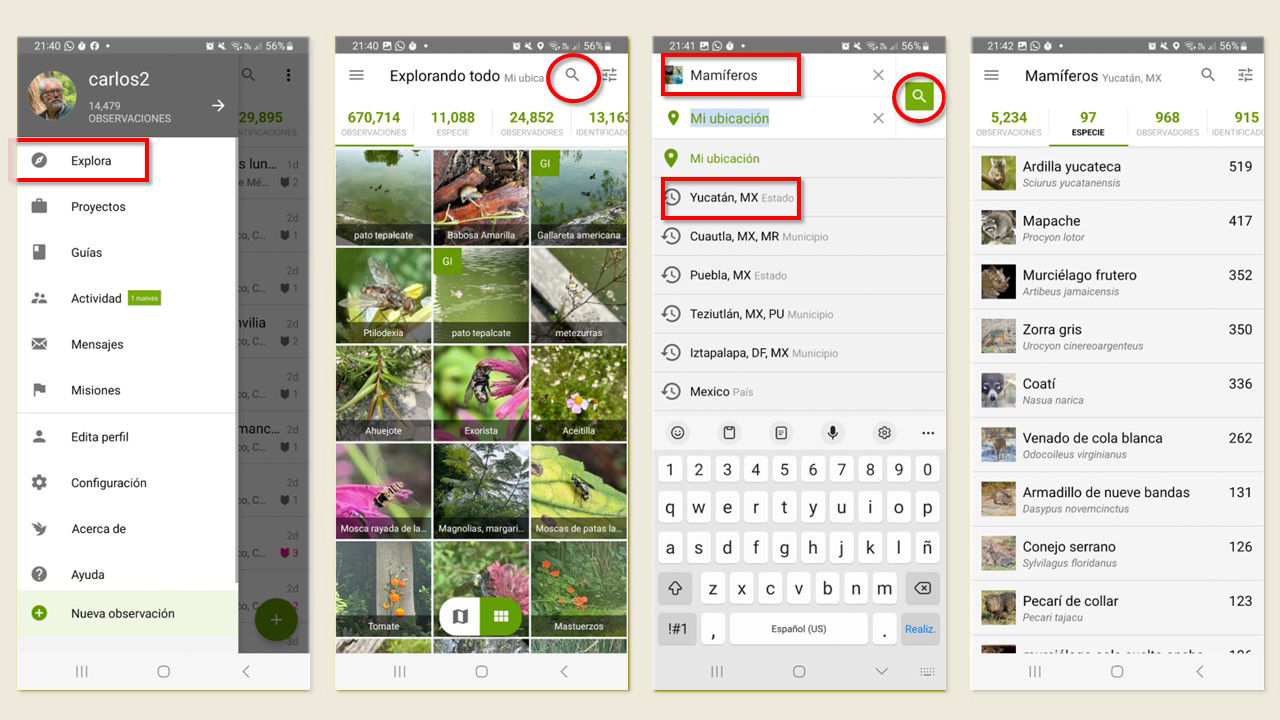 Con iNaturalistMX puedes hacer tus propias guías para cada municipio y para cualquier grupo de plantas, hongos o animales. En la versión de escritorio selecciona Explora en el menú superior. En el espacio de Especies, incluye el grupo que quieras en cualquier nivel taxonómico, puede ser una famila, un orden o una clase. En el espacio Ubicación, puedes incluir una localidad, municipio, estado, o área protegida. Para conocer las especies del grupo en esa ubicación selecciona el número de especies y obtienes las fotos de las especies organizadas por el número de observaciones registradas. Es importante tomar en cuenta que puede haber especies que aún no han sido registradas en esa región.